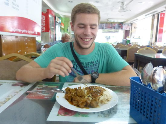 Wieder zurück auf Langkawi entscheiden wir uns dann, nach Hause zu laufen, weil es unterwegs eh an unserem neuen Stammrestaurant vorbeigeht und wir ja noch kein Mittag gegessen haben. Das habe ich übrigens noch gar nicht erzählt. Bei dem Restaurant direkt neben dem Hotel ist uns nach dem dritten Mal essen gehen beiden so schlecht geworden, das wir uns beinahe um den Platz an der Kloschüssel hätten streiten müssen. Seitdem gehen wir also immer woanders essen, wo es ebenfalls sehr lecker schmeckt, auch wenn das Fleisch für Marc zu viele Sehnen hat und ihm deshalb nicht zart genug ist. Überhaupt ist das Essen in Malaysia aber ansonsten ziemlich lecker, weil es mit den ganzen Gewürzen und leckeren dunklen Soßen wie gesagt ziemlich ähnlich mit dem indischen ist.