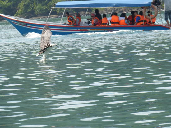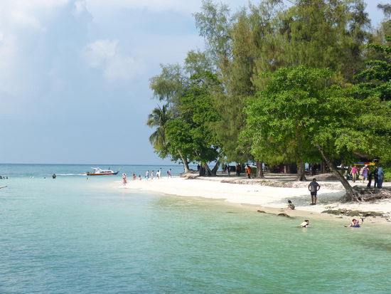 Am Hafen angekommen werden alle aufs Boot geladen und mit Schwimmwesten ausgestattet, bevor es mit über 50 km/h, was mit einem Boot weiß Gott schneller ist, als es sich zunächst anhört, zum ersten Ziel geht: Eine Insel mit schönem Strand. Auf Badengehen und dann mit nasser, versalzener Badehose wieder im Boot zu sitzen, haben wir heute aber keine Lust. So verbringen wir die nächsten anderthalb Stunden damit, zusammen mit den vielen anderen Besuchern die Leute zu beobachten, die sich von irgendwelchen frechen Affen ihr Frühstück klauen lassen. Sehr amüsant.