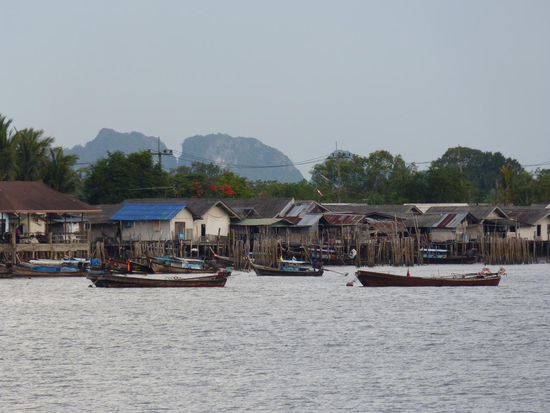 Wir sind wieder die Ersten, die abgeholt werden und entsprechend pünktlich steht man um kurz vor halb acht vor unserer Tür, bevor es, nach dem Einladen weiterer Gäste, nach Ao Nang geht. Nach dem Gepäckunterstellen schichtet man uns alle in einen wesentlich größeren, aber mit genauso unbequemen Holzbänken auf der Ladefläche ausgestatten LKW um, der uns zum Hafen bringt, bzw. dem Strandabschnitt, wo hunderte Boote vor Anker liegen, um die tausend und abertausend Touristen abzufertigen. Auch hier ist für Europäer gerade Nebensaison, weshalb gut und gerne achtzig Prozent unserer Gruppe Asiaten sind.