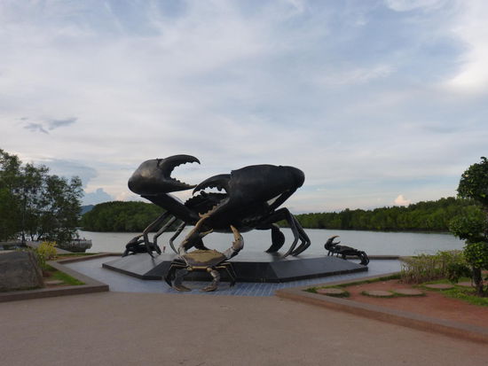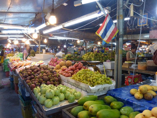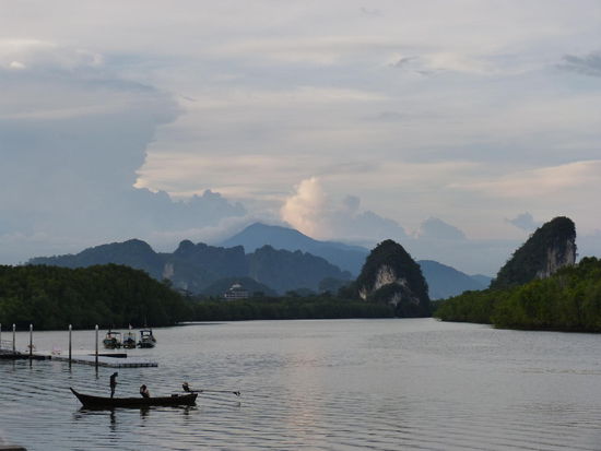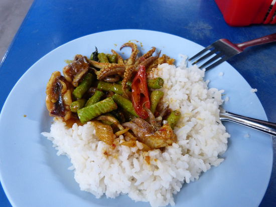Danach geht's dann erstmal was essen, wobei die Portion für 2€ schon sehr klein geraten ist. Naja, gibt's eben kein Trinkgeld. Viel kann man in Krabi dann auch nicht machen, außer am Flussufer auf und ab zulaufen, den wunderschönen Blick auf die grünen, zerklüfteten Berge im Osten genießen und über den Markt schlendern, was wirklich sehr empfehlenswert ist und wo wir uns dann auch noch mal etwas zu essen holen: Sehr scharf gewürzte Meeresfrüchte mit Gemüse und Reis für weniger als 1,5€, da gibt man dann auch gerne Trinkgeld.
