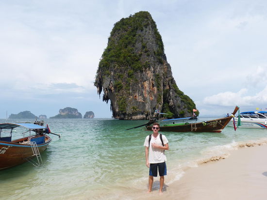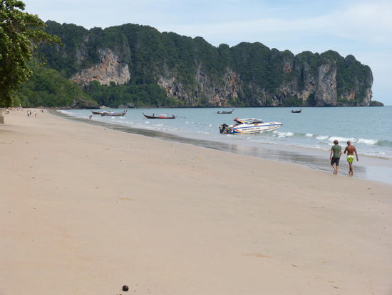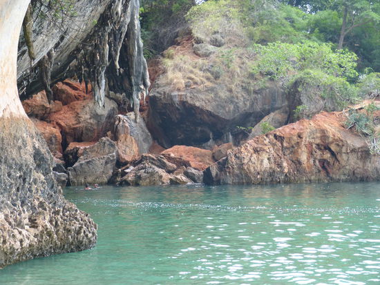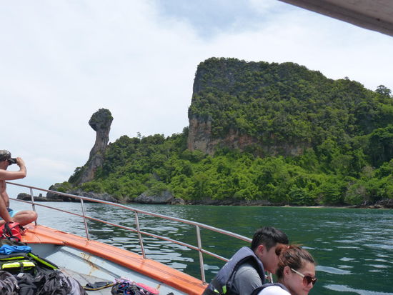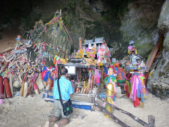 Ich habe keine Ahnung, wie viele hunderte Inseln vom großen, zerklüfteten Felsbrocken bis zur Trauminsel mit weißem Sandstrand es in den Gewässern vor Krabi gibt, aber es ist wirklich schön. Nur Einsamkeit, die sucht man hier vergeblich und so drängen wir uns im Strom der Massen bei unserem ersten Stopp am schmalen Strandabschnitt entlang zu einer Höhle im rauen Fels des Inselberges. Naja, letztlich ist es mehr eine große Ausbuchtung unter einem Felsvorsprung und entsprechend finden wir es jetzt auch nicht ganz so spektakulär, wie man hier zwei, drei kleine Buddha aufgestellt hat, um die unzählige bunt angemalte Holzpenisse im Sand stecken.
