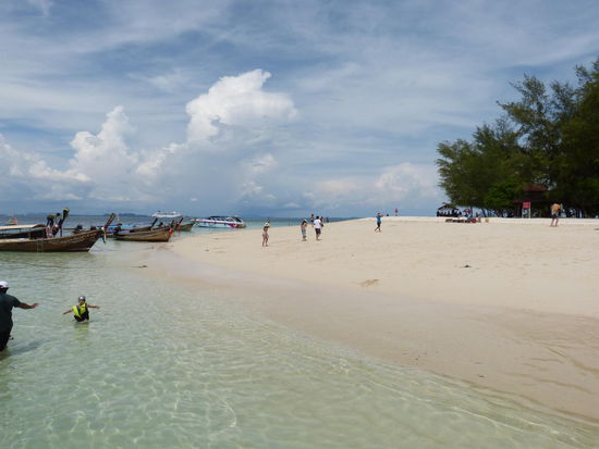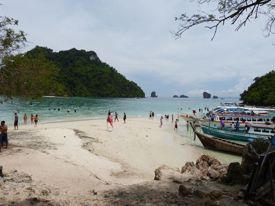 Danach geht es weiter zu zwei winzigen Inseln, die durch eine Sandbank miteinander verbunden sind, über die man während der Ebbe sogar trockenen Fußes kommt. Außerdem gibt es hier direkt am Strand das inkludierte Mittagessen, das wirklich super lecker, für so eine Touristentour allerdings überraschend scharf ist. Überhaupt ist das thailändische Essen im Vergleich zum bisherigen asiatischen Essen ziemlich scharf, weil diese reine Peperonischärfe irgendwie wesentlich stärker im Mund und an den Lippen brennt. Aber es gibt genug kostenloses Wasser zum Kühlen. Mit vollem Magen geht es wieder zum Plantschen ins Wasser, wo sich zwei Chinesen angewidert mit einer Seegurke bewerfen, während die restlichen Familienmitglieder so lange lachend drumrumstehen, bis sie selbst abgeworfen werden.