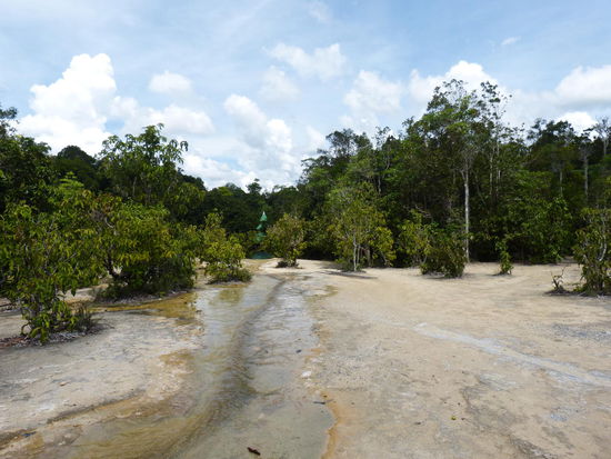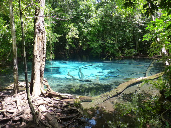 Es ist kurz nach acht als wir in den bereits wartenden Kleinbus einsteigen und nachdem wir alle Gäste eingesammelt haben, geht es direkt zu den heißen Quellen. Wenn man schon da ist, muss man natürlich auch baden gehen, ansonsten wären uns kalte Quellen bei der Hitze wesentlich lieber gewesen. Zumal es auch räumlich sehr begrenzt ist, wie man sich so mit den ganzen anderen Touristen in die kleinen Wasserlöcher drängt, die vom heißen Quellwasser durchspült werden. Danach geht's zum Emerald Pool, wo der Eintritt in den Nationalpark mit 200 Baht schon ein knappes Drittel der gesamten Tourgebühr aufzehrt. Daher also der höhere Tourpreis. Einheimische zahlen übrigens mit 20 Baht gerade mal ein Zehntel.