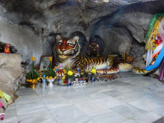 Auch als wir dann die Tigerhöhle erreichen, schüttet es leider munter weiter, womit sich der Aufstieg zum Bergtempel erledigt hat. Sehr schade, denn das sollte für uns das eigentliche Highlight der Tour werden. Die Aussicht von diesem riesigen allein stehenden Felsen muss unglaublich sein. Hätte das Wetter nicht gestern oder vorgestern so schlecht sein können? Als der Regen nach einer halben Stunde zumindest ein bisschen nachlässt, können wir uns wenigstens noch die Höhle anschauen. Na gut, ist eben wieder eine Ausbuchtung in der Felswand, wo mal ein Tiger gelebt haben soll und die man nun zu einem Tempel umgebaut hat, mit dem man seitdem Spendengelder eintreibt.