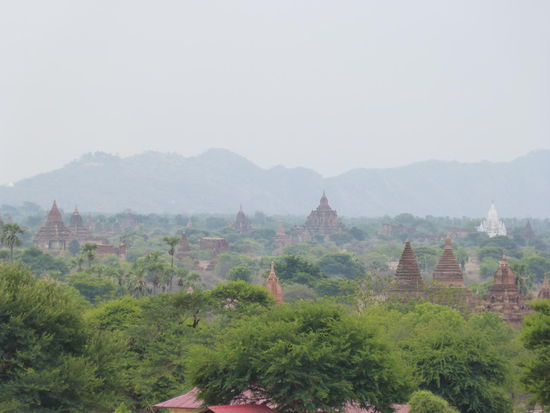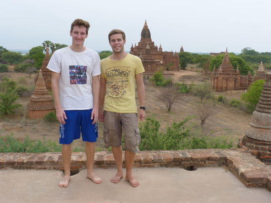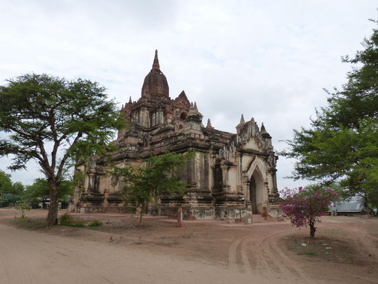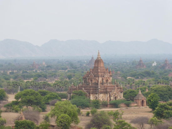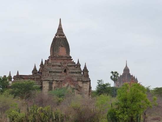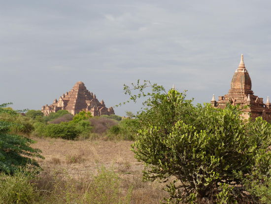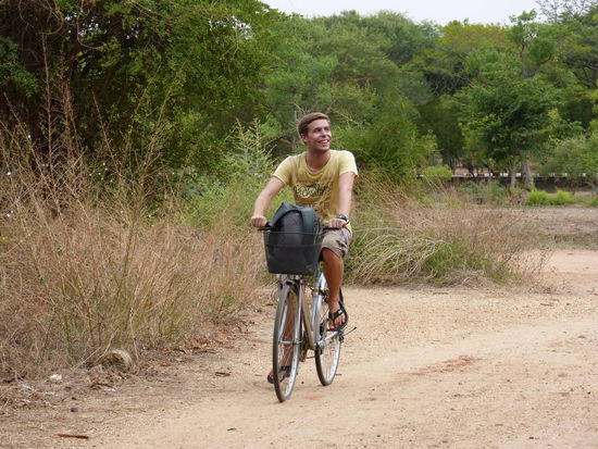 Zu den einzelnen Pagoden führen von der Hauptstraße aus immer wieder kleine Sandwege, die sich allerdings selbst mit unseren Rädern überraschend gut befahren lassen. Wie viele kleine, große und zum Teil riesige Pagoden es hier gibt, ist aber auch nicht mehr normal. Dieses ganze Gefühl der endlosen Weite der Pagodenlandschaft muss man wirklich am eigenen Leib erfahren. Kein Foto und keine Erzählung kann beschreiben, wie es ist, wenn man auf dem Dach eines dieser alten Ziegelbauten steht und soweit das Auge reicht nur andere Pagodenspitzen zwischen den grünen Baumkronen der staubbraunen Savanne emporragen sieht, bevor sich die Weiten irgendwo am Horizont im diesigen Schatten der fernen Berge verlieren.