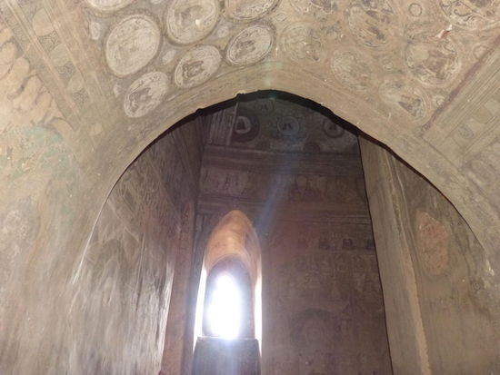 Auf dem Plan steht die ebenfalls sehr pagodenreiche Region drei, vier Kilometer südlich von Nyaung U. Als wir die Hauptstraße an der Kreuzung, wo es in die andere Richtung zum Flughafen geht, verlassen, sind wir die nächsten zehn Minuten die einzigen auf dieser Straße, die mitten durch die verlassene Savanne führt. Es ist ein absoluter Traum. Der Asphalt geht in einem ausgetrockneten Flussbett in Staub über, der uns die nächsten Kilometer erhalten bleiben soll. Es geht weiter durch ein einsames Dorf, an Gruppen der alten Backsteintempeln vorbei und hin zu einer Ansammlung kleiner Pagoden, die sich durch ihre noch ausgesprochen gut erhaltenen Wandmalereien auszeichnen.