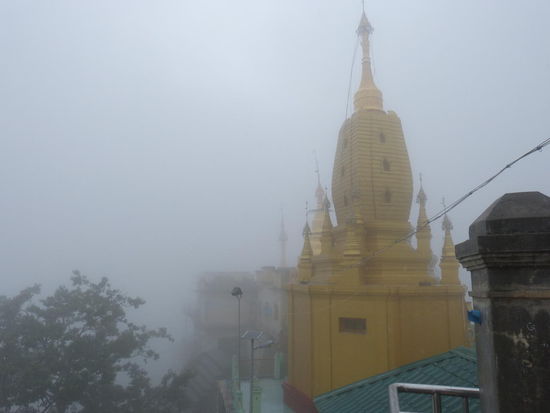 Oben angekommen kann man sich dann im vom Wind peitschenden Sprühregen dichte Wolken angucken und ab und zu mal die Schatten des Dorfes am Fuße des Berges. Wirklich sehr ärgerlich mit dem Wetter. Fotos kann man total vergessen. Auf dem Rückweg wird dann noch am Obstmarkt ein großer Beutel Mangos eingekauft, bevor wir uns vor dem inzwischen auch in Bagan einsetzenden Monsunregen, der alles unter schwarzen, zugemüllten Schlammflüssen verschwinden lässt, aufs Zimmer zurückziehen.