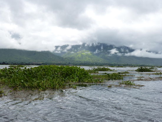 Dass wir dann für unsere Tour zu Fuß abgeholt werden ist auch mal was Neues und so dackeln wir unserem einheimischen Guide bis zur Anlegestelle des braunen Flussarmes hinterher, von wo aus es im schmalen Langboot in Richtung See geht. Wieder nur wir und der Guide, weil man sich in Myanmar andere Tourgäste wie gesagt fast immer selbst organisieren muss/müsste. Der aktuell an tiefster Stelle kaum mehr als drei Meter tiefe Inle See wird dann zur Mitte hin sogar relativ klar, bevor wir auch schon wieder in Richtung Ufer einlenken und am mehrere Meter höher gelegenen Steg anlanden. Am Ende der Regenzeit liegt der Wasserspiegel entsprechend wesentlich höher und vermutlich reichen dann auch die ganzen Wasserschlingpflanzen nicht mehr bis direkt an die Oberfläche.