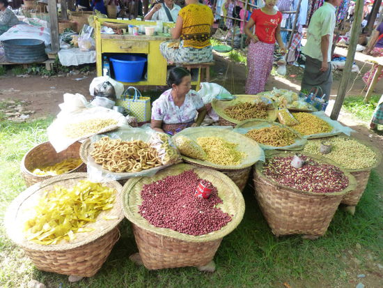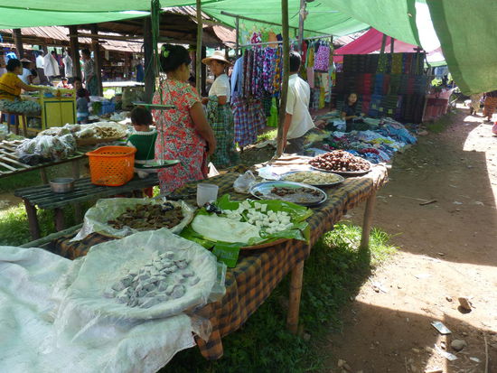 Unser Guide drückt uns zwei Regenschirme in die Hand, erklärt in gebrochenem Englisch, wie wir zum Markt kommen und macht's sich auch schon wieder im Boot bequem. Also wandern wir im Nieselregen allein zum Einheimischenmarkt, auf dem es von Gemüse über Fleisch und Fisch bis hin zu Kleidung und Medikamenten mal wieder absolut alles gibt. Da dass Wetter hier auch schneller wechselt als im deutschen April, geht es schließlich im Sonnenschein wieder zurück zum Boot und weiter auf den offenen See zu den Anglern, die mit einem unglaublichen Gleichgewichtssinn auf einem Bein stehen, mit dem anderen rudern und währenddessen ihre Netze auslegen. Sensationell.