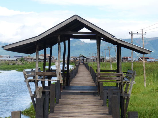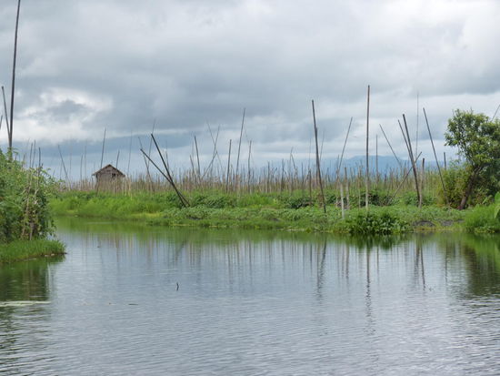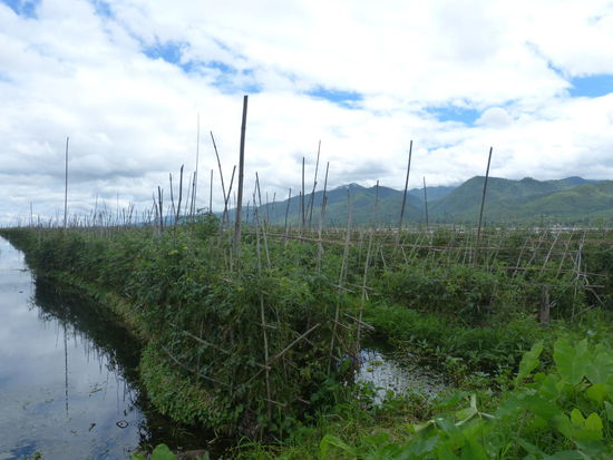 Weiter geht es zu den schwimmenden Gärten, bei denen diverse Gemüse- hauptsächlich Tomatenpflanzen einfach in einem schwimmenden Dickicht aus Wurzeln, ein bisschen Erde und flachen Pflanzen direkt auf dem Wasser wachsen und nur durch lange in den Seegrund gerammte Holzstäbe vom Wegtreiben gehindert werden. Die durchs einfache an der Oberflächeschwimmen gegebene Anpassung an den Wasserspiegel ermöglicht volle drei Vegetationsfolgen von Tomaten in einem einzigen Jahr. Ganz Myanmar wird aus dieser Region mit Tomaten versorgt.