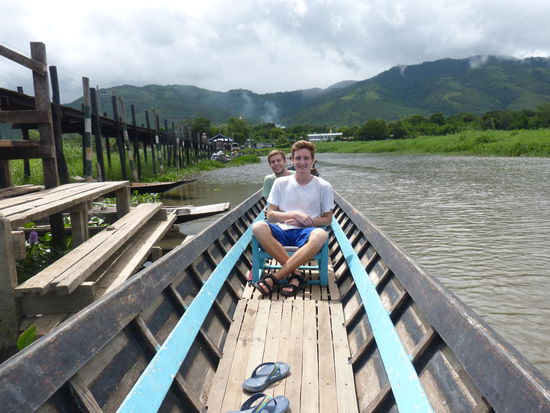 Es werden noch ein nicht ganz so spektakuläres Kloster und eine große Pagode besichtigt, bevor wir auf dem Rückweg den Fischern dabei zusehen, wie sie ihre gelegten Netze wieder einholen. Und obwohl wir uns keine zehn Minuten zuvor noch unterm Regenschirm verkriechen mussten, hat es die Sonne mal wieder geschafft, uns zu röten, obwohl wir uns sogar eingecremt haben. Vermutlich ist die Sonnenintensität hier wegen der Spiegelung durchs Wasser wesentlich stärker als bisher in Myanmar. Unser Guide findet es auf jeden Fall super witzig, mir die ganze Zeit auf meine aktuell schweinchenrote Haut zu drücken, die dann für einen kurzen Moment wieder gelblich hautfarben wird.