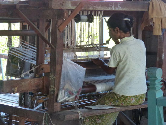 Des niedrigen Wasserspiegels wegen sind die Holzpfähle, die ganze Dörfer in mehreren Metern direkt über dem Wasser halten, aktuell natürlich besonders lang. Wohnhäuser, Hotels, ganze Resorts, Restaurants und Schulen, wirklich alles ist hier mit einer Selbstverständlichkeit auf Pfählen ins Wasser gebaut, dass man sich nur die Augen reiben kann. Beim Durchfahren der Dörfer legen wir immer wieder kurze Stopps ein, wo wir Leuten beim Zigarrenrollen, Bootbauen und Stoffherstellen zusehen. Ein wirklich unfassbarer Aufwand, wie die Frauen hier erst die Fäden aus Lotusstängeln ziehen, rollen und über diverse weitere Prozesse an Webstühlen zu sehr schwerem Stoff verarbeiten. Am Ende der ganzen Führungen wird man, wie sollte es anderes sein, durch die Verkaufsregale geführt.