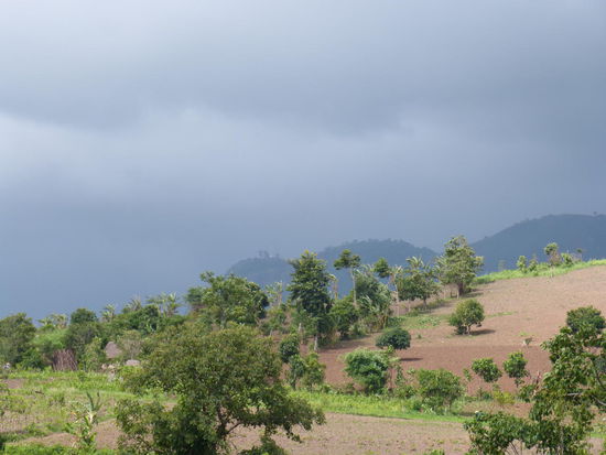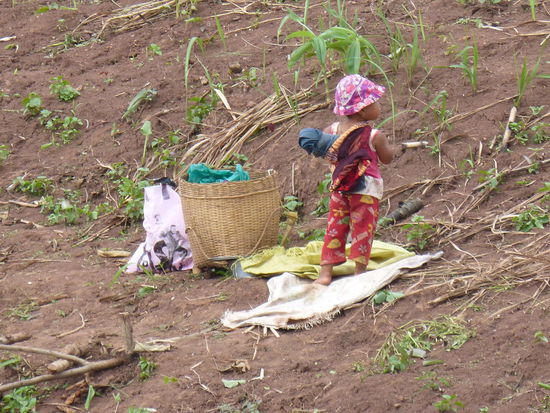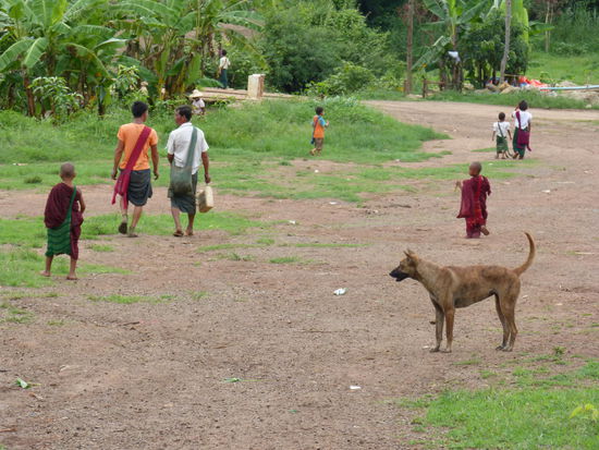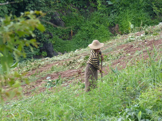Die Mittagssonne meidend geht es heute entsprechend später los, um ein bisschen die nähere Umgebung zu bewandern. Die den See umgebenden grünen Bergketten sind leider wesentlich weiter weg und schwerer zu erreichen als gedacht und so braucht es schon mal eine volle Dreiviertelstunde, bis wir überhaupt erst die kerzengerade Hauptstraße verlassen und auf einem sandigen Feldweg den ersten Hügel hinaufsteigen. In der dahinter gelegenen Senke gelangen wir in ein touristenfremdes Einheimischendorf, in dem sich das erste Steinhaus noch in Bau befindet. Außer einer kleinen Mönchsschule gibt es hier auch sonst nicht allzu viel zu sehen und so geht es direkt weiter auf einem schmalen Trampelpfad durch die immer wilder werdende Natur. Da sich es bei dem Pfad leider nicht um einen für Touristen angelegten Panoramawanderweg handelt, ziehen sich die nächsten hunderte Meter allerdings nur durch die frisch bepflanzten Felder am Hangrücken statt oben auf dem Kamm entlang.