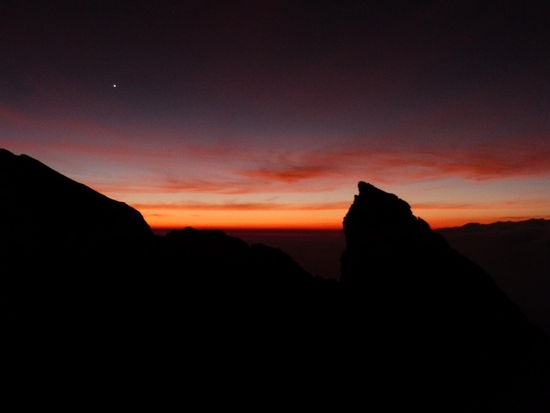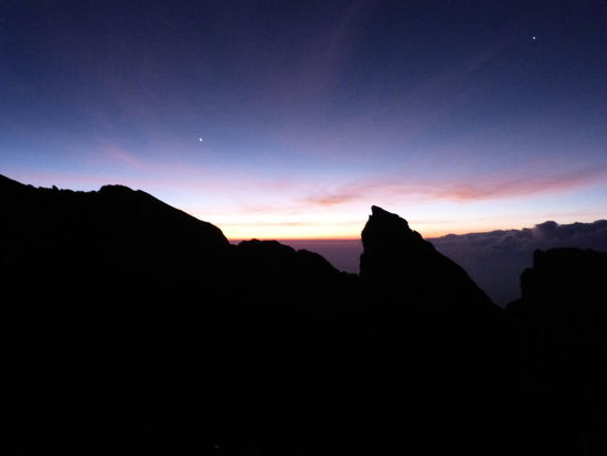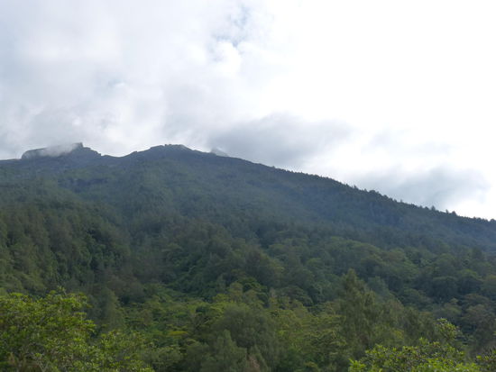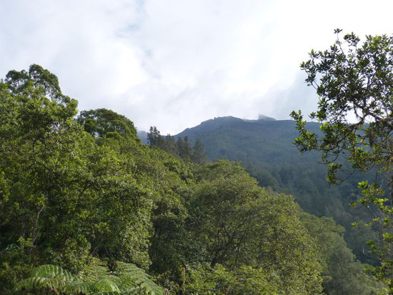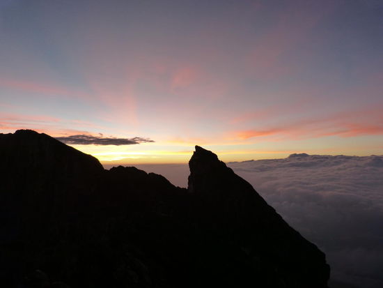 Auf zwei, drei Leute kommt jeweils ein Guide und in einer gut und gerne fünfzehn Mann großen Gruppe geht es schließlich im Gänsemarsch mit Stirnlampen bewaffnet den schmalen Pfad durch den Dschungel den Hang hinauf. Na toll. So hatten wir uns das wirklich nicht vorgestellt und diese Tour hat auch noch über 40€ pro Person gekostet. Bei einer der unzähligen Pausen überreden wir dann unseren Guide, sich vom Rest abzusetzen und nur zu dritt weiter zu wandern. Legt dieser Typ dann ein Tempo vor, das glaubt man kaum. Und obwohl es echt nicht gerade warm ist, schwitzt man sich wegen der hohen Luftfeuchtigkeit fast zu Tode, bevor einen die nächste kalte Windböe wieder zum schütteln bringt. Mit Erreichen der Baumgrenze legen wir dann wieder ein etwas langsameres Tempo ein, weil wir sonst eh zu früh oben ankommen und auf den Sonnenaufgang warten würden.