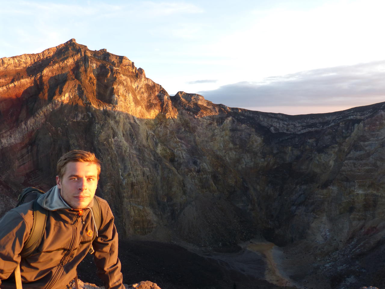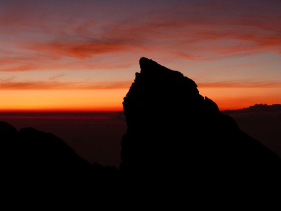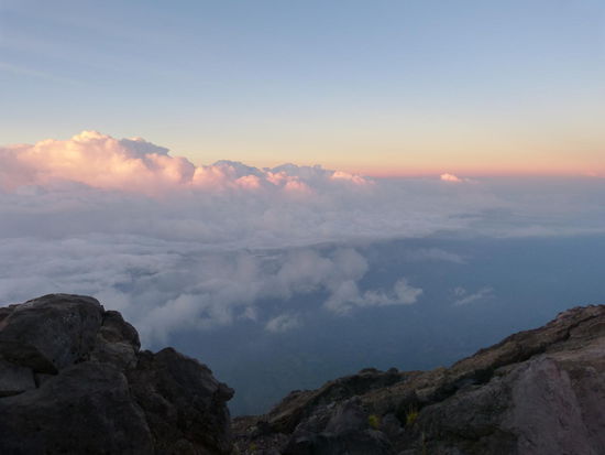 Es wird noch ein kurzer wehmütiger Blick auf den von hier aus über den schmalen Kraterrand unerreichbaren Gipfel geworfen und dann machen wir uns auch schon wieder an den Abstieg, in der Hoffnung, schnell wieder warm zu werden. Einen wirklichen Panoramablick hat man hier aber ohnehin ganz selten im Jahr. Für gewöhnlich verdichten sich die Wolken mit Anbruch des Tages so schnell, dass der gesamte Vulkan bereits am frühen Vormittag wieder vollkommen verhüllt ist.