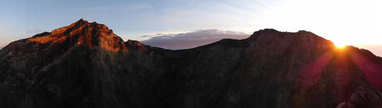 Der Weg wird immer schroffer und steiler und zwischenzeitlich müssen wir uns auf allen Vieren fortbewegen, um nicht vom Hang abzurutschen. Mit jedem Höhenmeter wird es jetzt kälter und man kann mehr und mehr Lichter der balinesischen Dörfer in mehr als zweieinhalbtausend Metern Tiefe erkennen. Der Ärger über die falsche Tour verschwindet allmählich und unsere Gedanken sind nur noch auf die staubigen Felsen vor uns gerichtet, bis wir schließlich gegen 5 Uhr morgens ziemlich erschöpft den immer noch in vollkommene Dunkelheit gehüllten Gipfel erreichen. Also na ja, es ist ja eben nicht der Gipfel, sondern ein anderer Aussichtspunkt am sehr schroffen und steilen Kraterrand. Wie steil sich der Krater direkt neben uns in die Tiefe stürzt, bekommen wir erst nach Sonnenaufgang zu Gesicht. Bis dahin warten wir also zusammengekauert, sich vor dem eisigen Wind schützend mit einer immer größer werdenden Gruppe Touristen und deren Guides zwischen irgendwelchen Felsbrocken.
