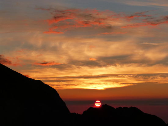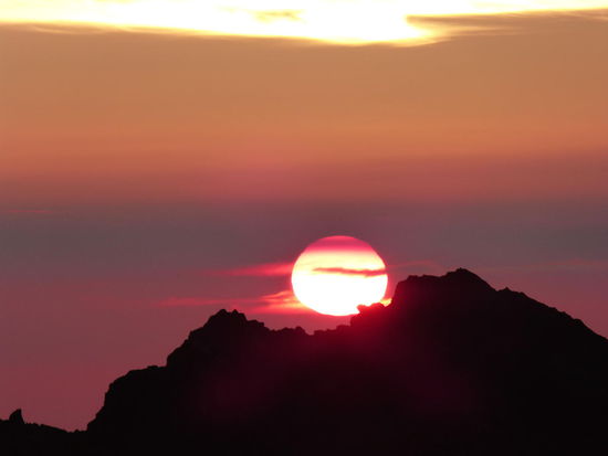 Ganz langsam mischt sich schließlich im Osten ein heller Schleier in die schwarze Nacht. Die Wolkendecke verdichtet sich derweil und bis zum Schluss bleibt offen, ob sich die Sonne rechtzeitig zeigen wird, oder wie die letzten Tage nur hinter dicken Wolken zu erahnen ist. Doch wir haben Glück und ein roter Feuerball steigt schließlich gegen kurz nach sechs Uhr morgens über den schwarzen Kraterrand des Agung Vulkans. Ein großartiger Anblick.