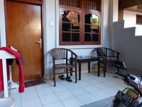 Für den von uns vorgeschlagenen Preis will uns der Taxifahrer nur an den Anfang der Legian Street fahren, weil er wegen der Einbahnstraße sonst einen riesigen Umweg fahren müsste. Irgendwie auch verständlich und letztlich ist es so eben nicht nur günstiger für uns, es geht vermutlich auch noch schneller, wenn wir die letzten 100 Meter zu Fuß laufen. Außerdem werden wir auf diese Weise direkt bei unserem Reisschleimverkäufer vom letzten Mal rausgelassen. Mit lecker gewürztem Schleim, Hühnerinnereienspießen, Wasserflaschen und vollem Gepäck geht es die wohlbekannte Legian hinauf, bis zum geliebten Skygarden und einige Meter weiter in eine kleine Gasse zu unserem vorgebuchten Hotel. 15€ für ein Zimmer mit Klimaanlage und leckerem Frühstück sind auch okay, zumal wir wieder einen Pool im Hof haben, wenn auch kleiner als damals im Prawita Hotel.