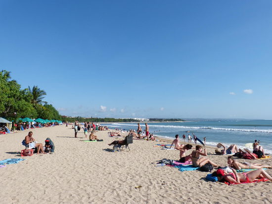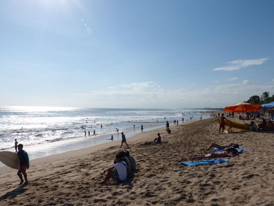 Immerhin finden wir dieses Mal auch heraus, dass Kuta einen doch sehr schönen Strand hat. Es ist zwar ein gutes Stück zu laufen durch die Poppies 2, die Straße, in der sich unser Hotel befindet und die Strandpromenade und Legian miteinander verbindet, aber wir schaffen es trotzdem bis auf ganz wenige Ausnahmen, jeden Tag für mindestens eine Stunde an den Strand zu gehen. Ewig in der Sonne brutzeln ist nun mal eh nicht so unser Ding und so sind wir meistens die gesamte Strandzeit im Wasser und vergnügen uns mit den erstaunlich guten Wellen, die leider auch von hunderten Surfern geschätzt werden. Aber gut, muss man eben weiter vorne bleiben, wo die Surfer einem nicht gleich voll in die Seite brettern.