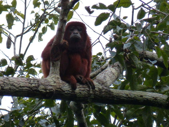Das Geräusch eines startenden Flugzeuges lenkt plötzlich unsere Aufmerksamkeit auf sich. Natürlich handelt es sich nicht um ein Flugzeug, sondern um irgendeine Brüllaffenart, die den gesamten Dschungel mit diesem ohrenbetäubenden Rauschen zusammenschreit. Im Sturmschritt geht es weiter durchs Dickicht, bis wir nach einer Viertelstunde endlich am Fuße eines monströsen Baumes stehen in dessen Gipfel eine Brüllaffenfamilie haust und uns skeptisch von oben herab mustert.