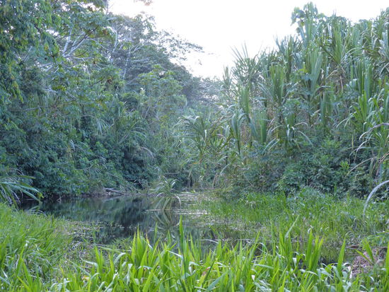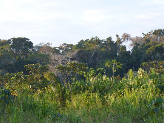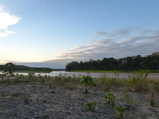 Am Nachmittag geht es dann noch mal für 3-4 Stunden los, den Weg für die Nachtwanderung ebenen. Über diverse Trampelpfade gelangen wir an einen Beniriverzufluss, wo wir in einigen Stunden Tapire und andere Tiere auf der nächtlichen Suche nach Wasser anzutreffen hoffen. Das Versinken der Sonne hinter den majestätischen Kronen der Dschungelbäume bekommen wir auf diese Weise auch noch zu Gesicht.