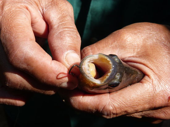 Heute Vormittag steht wieder Piranhafischen auf dem Plan. An einem Tümpel im Dschungel, wo es von Mücken und furchtbar aufdringlichen Fliegviechern nur so wimmelt. Immerhin habe ich heute das Glück, keinen Fisch zu fangen, dem ich beim Hakenrausziehen wieder irgendwelche Leiden zufüge, nur um ihn dann wieder ins Wasser zurückzuwerfen. Dafür fängt Marc heute einen und der Guide zieht auch was an Land.