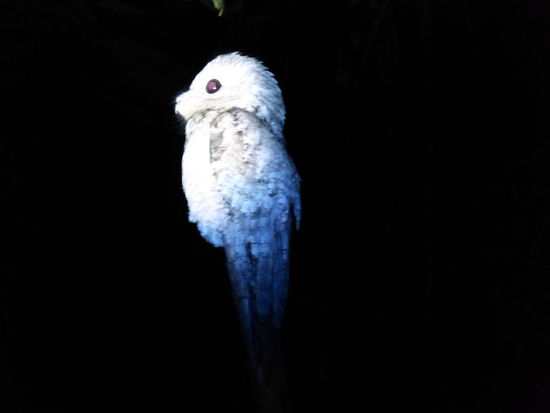 Nach dem Abendessen geht es dann den gleichen Weg durchs Dickicht zum Fluss. Einige giftige, aber wohl nicht tödliche Spinnen spinnen ihre Netze am Wegesrand, während eine Gruppe nachtaktiver Äffchen im Blätterdach über uns herumturnt. Bei der Überquerung eines kleinen Baches kommt uns noch ein Käuzchen, oder Eule, oder was auch immer für ein nachtaktiver Vogel vor die Linse und lässt sich fürs Foto fast fünf Minuten lang von unserem Guide direkt mit der Taschenlampe anleuchten.