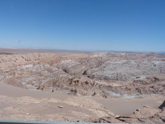 Zwei Stunden später sitzen wir dann auch schon im Bus nach Calama. Landschaftlich ist die Atacamawüste schön anzusehen, aber für uns ist es nach Südbolivien nichts wirklich Neues und Calama entpuppt sich leider als für unsere Verhältnisse echt teuer. Gut zwei Stunden laufen wir mit vollem Gepäck durch die Innenstadt und fragen an jedem einzelnen Hostel und Hotel, wie teuer denn ein Zimmer für uns wäre. Private Bäder sind hier ohnehin die absolute Seltenheit und wenn, dann fernab unserer Preisvorstellung und so kommen wir dann für 23€ in einem Doppelzimmer mit Gemeinschaftsbad unter. Selbst das tausendmal bessere Milton war ein bisschen billiger und da hätten wir das Einzelbad nicht so nötig gehabt, wie jetzt mit M-D-Virus.
