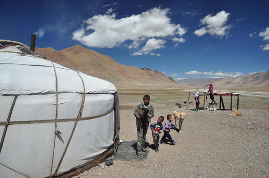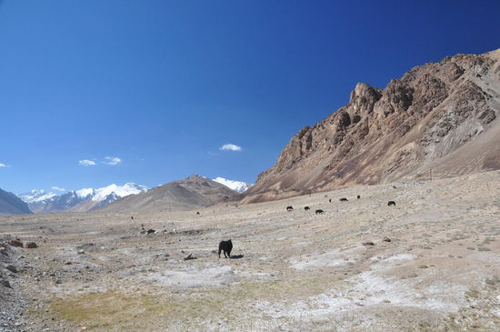 Wir ließen Murghab hinter uns, und nahmen nicht die Straße nach Osten, die nach China auf den zum in Pakistan liegenden Khunjeraab Paß bzw. Karakorum Highway führt, sondern fuhren weiter nach Norden den Pamir Highway entlang stets auf die kirgisische Grenze zu. Die Landschaft die uns links und rechts der Straße darbot war von einer unbeschreiblichen Schönheit und Schlichtheit, war es ja kaum mehr als eine in den Bergen liegende, grob zerklüftete und über die Jahr Millionen geformte Steinwüste, die ab und an von kleinen, klaren und in der Sonne schimmernden Bächen zerstückelt wurde. An wenigen Stellen noch sahen wir rindsgroße Yaks, die mit dickem schwarzen Fell und dem unbezwingbaren Drang nach Nahrungsaufnahme der Wüste die wenigen groben Grasbüscheln und Sträuchern, die auf der Höhe von rund 4350 m noch wuchsen, abrangen. Besonders überraschte die enorme Farbvielfalt in der scheinbar so einseitigen Landschaft. Das Sonnenlicht brach sich im glitzernden Gestein der scharfkantigen Felsen und warf seine Farbpracht auf die steilen, schneebedeckten Hänge, wo es sich mit dem tiefen Blau des Himmels und dem Weiß der Wolken kontrastierte und eine einmalige Atmosphäre schuf, die uns staunend verharren ließ. Zu unserer großen Verwunderung waren wir bereits an die chinesische Grenze gelangt, die sich rechts der Straße entlang der hohen Berge schlängelte. Wir vergleichen den Verlauf der Grenze mit den Zeichnungen in der Landkarte und stellen fest, daß die "offizielle" Grenze einige km weiter im Osten sein müßte. Nachdem unser Fahrer aber bestätigt, daß es sich rechts des Zauns bereits um das Reich der Mitte handle, nutzten mein Bruder und ich an einer durchlässigen Stelle, der Zaun schien hier durchtrennt worden zu sein, die Möglichkeit eines kurzen Übertretens auf chinesischen Boden. Als wir schließlich die Paßhöhe des Ak-Baiktal (4650 m) erreicht hatten, blickten wir in ein im Westen gelegenes Seitental und unser Freund schlug vor, die aus der Ferne kaum wahrnehmbaren beiden Behausungen am Fuße der schneebedeckten Berge aufzusuchen. Unser Fahrer willigt ein, den Abstecher zu unternehmen und wir fahren nahezu 45 min durchs Gelände, durchqueren mehrere kleine Bäche ehe wir, von einem etwas breiteren Bach getrennt vor den zwei einsam stehenden Jurten getrennt anhalten. Neugierige Kinder eilen jenseits des Baches herbei, um die vermeintlich noch nie da gewesenen Fremden aus der Ferne zu beobachten. "Ich sollte wieder ins Auto einsteigen", läßt mich unser Fahrer wissen, als ich versuche, den eiskalten Bach zu Fuß zu durchqueren. Schon sitze ich auf der Beifahrerseite und lasse das kalte Wasser unterhalb der Achsen des Jeeps vorbeifließen. Etwas schüchtern stehen die Kinder, ihre Mutter und Großmutter vor uns und wissen nicht, wie man den fremden Gästen am besten begegnet. Es erweist sich als eine gute Entscheidung, daß wir in Doshanbe bereits auf dem grünen Basar die verschiedensten Nuß- und Trockenfruchtsorten gekauft hatten, die wir nun an die Kinder verteilen. Es beginnt das übliche Spiel, wer die die Hand voll Nüsse bekommt, allerdings zieht der "Sieger" nicht von Dannen, sondern verteilt die ergatterte Leckerei an die Kleineren, worüber wir sehr staunen. Wie bereits schon fast traditionell üblich, bringen wir auf dieser Reise auch wieder Stoff- und Plüschtiere mit, die wir vor unserer Abfahrt in Kempten noch eilig in die leeren Ecken unserer Rucksäcke packten. Stofftiere und gut erhaltene Kleidung fanden somit bereits vom indischen Subkontinent bis auf die indonesischen Molukken dankbare und sichtbar glückliche Abnehmer - zumeist Kinder. Die Freude der Kinder über die unerwarteten Gaben wird höchstens noch vom tantrisch sich wiederholenden "Rahmat, Rahmat, Rahmat, ... ey Rahmat, ..." der emotional gerührten Großmutter übertroffen, und schon bald bittet uns die stets freundlich lachende Dame zum Chai in ihr kleines Haus, was wir dankend annehmen. Gestärkt durch einige Yakbutterbrote und eine Schüssel Joghurt spielen mein Bruder und ich mit den Kindern, schaukeln sie und geben beim Handstand Hilfestellung, ehe wir den Rückweg zur Hauptstraße antreten. Der Weg nach Karakul ist nicht mehr weit, wir sind auf der Hauptstraße rund zwei weitere Stunden unterwegs und entscheiden uns, die Nacht in einer Jurte zu verbringen.