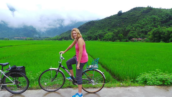 Unser gebuchter Bus holte uns also morgens um 7.30 vom Hotel ab und dann ging es ca. 4 Stunden Richtung Nordwesten hoch nach Mai Chau. Unser gebuchtes Mehrbettzimmer war sowas wie ein Matratzenlager was nach Hund stank. Die Unterkunft an sich ist ein sogenannter "homestay". In einigen Dörfern und auch Städten fangen Einheimische an, ihr Haus mit Zimmer oder in dem Falle hier mit Bungalows zu erweitern. Man wird dann von der Hausfrau bekocht und man bekommt einen Einblick wie die "locals" leben. Gegen 16 Uhr hörte es mit regnen auf und wir schnappten uns zwei Fahrräder und erkundeten das naheliegende Dorf. Danach machten wir es uns wieder im homestay gemütlich, plauderten mit anderen Reisenden und warteten bis das Abendessen serviert wurde. Es gab eine große Schüssel Reis, Frühlingsrollen, Chicken und paar Schüsseln mit Grünzeug. War sehr lecker und sie bemühten sich sehr alles nachzufüllen.