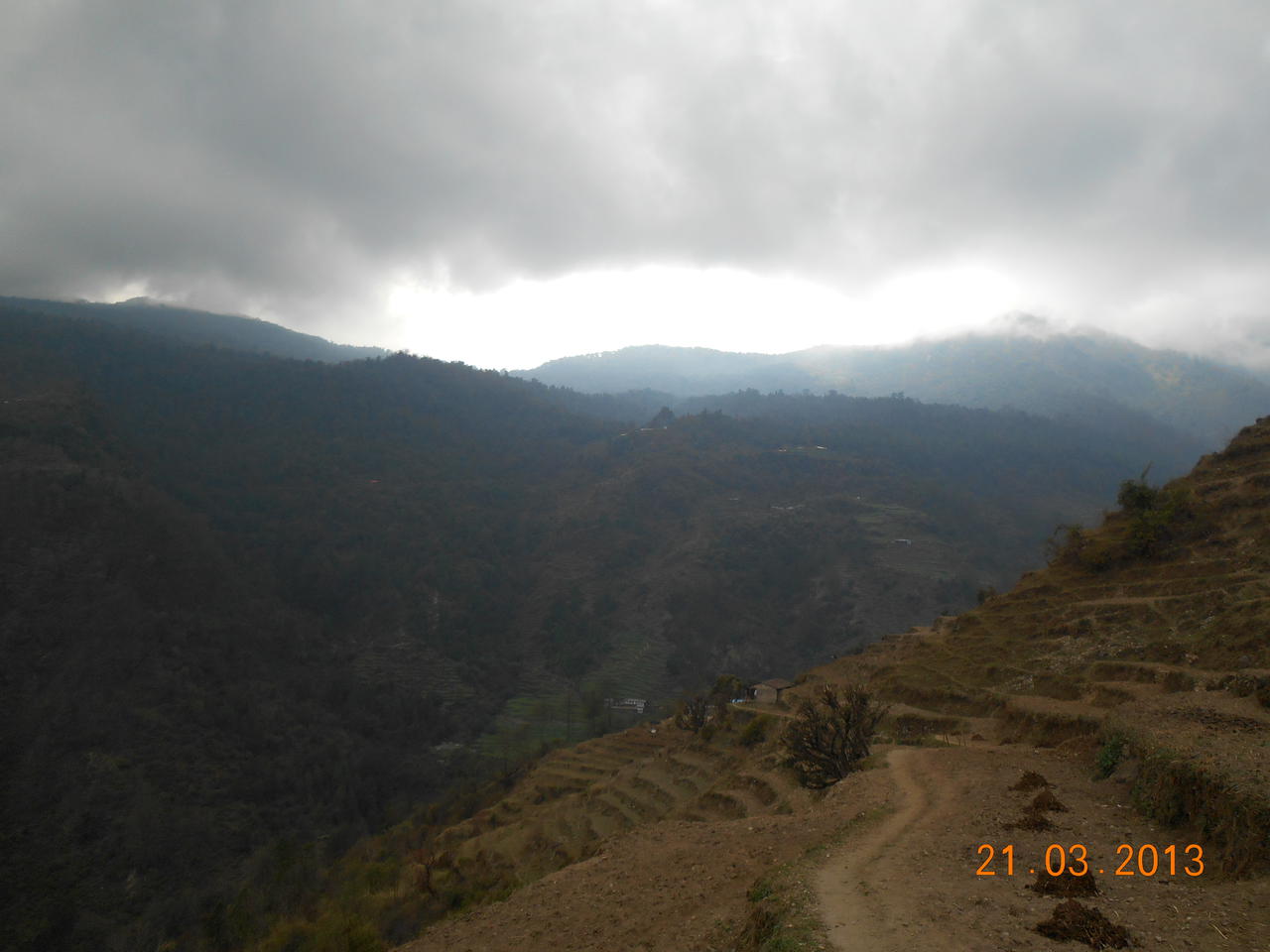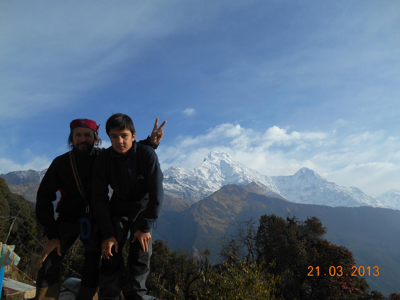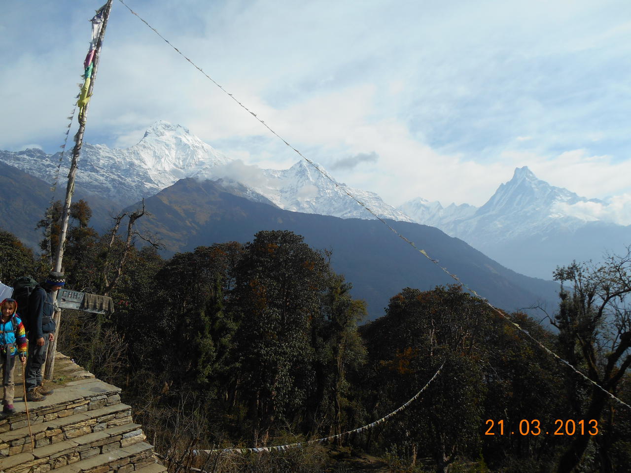 Nach einem Frühstück im Freien und einer Wahnsinnsaussicht auf die Eisberge, denen wir uns immer mehr annäherten, machten wir uns auf nach Chhomrong. An diesem Tag ging es erst einmal richtig steil abwärts, aber nicht mal eben 20 Min., sondern ausgedehnte 1-2 Stunden. Auch das Abwärtslaufen hatte es auf Dauer in sich, denn die Beine wurden ganz anders beansprucht, als wir es seit drei Tagen gewohnt waren - also neuer Muskelkater .