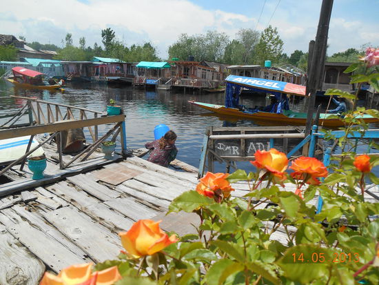 Vor vielen Jahren hatte mir ein Freund von den Hausbooten in Srinagar erzählt und ich war natürlich gespannt, ob es wirklich so toll ist, wie er es damals beschrieben hat. Wir zogen mit einem Mann aus dem Touristenzentrum los, der uns helfen wollte, ein passendes Boot zu finden. Er war wirklich sehr nett und brachte uns per "Sultangondel" - ein Boot mit bequemen Matratzen, das auch Shikara genannt wird - zu einem Hausboot namens Pride of India. Wir waren begeistert von den Räumlichkeiten. Doch der Preis für ein Zimmer mit Bad sollte 1500,- Rs betragen und das konnten bzw. wollten wir uns einfach nicht leisten. Darauf zeigten sie uns ein kleineres Boot gleich neben dem Hauptboot, das zwar nicht so luxuriös, dafür aber auch mit allem ausgestattet war, was man so braucht. Wir könnten das ganze Boot für 800,- Rs haben, meinte der Mann, mit dem wir verhandelten. Letztendlich einigten wir uns dann auf 600,- Rs und zogen wieder los, um unsere Kinder zu holen. Als diese später das Boot sahen, waren sie ganz aus dem Häuschen, da wir so viele Räume ganz für uns allein hatten .