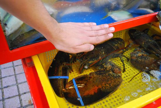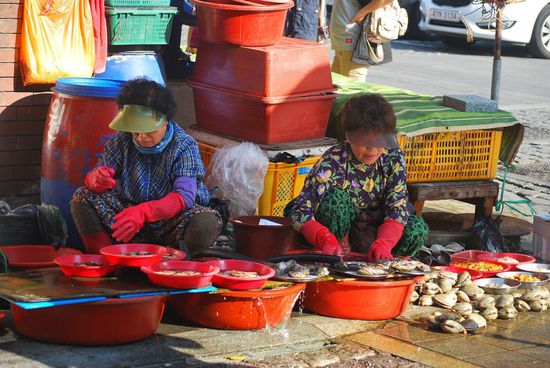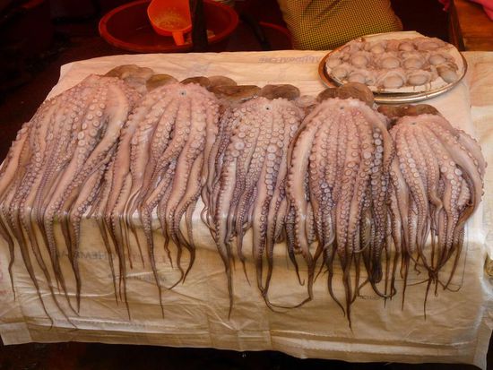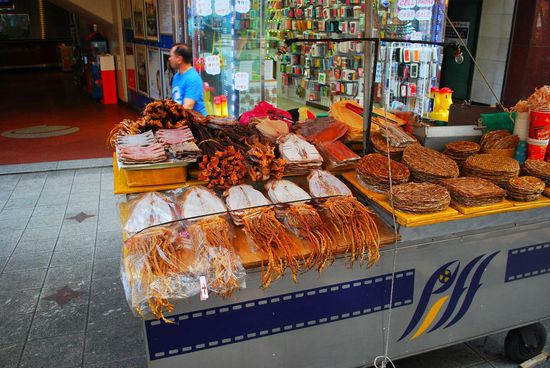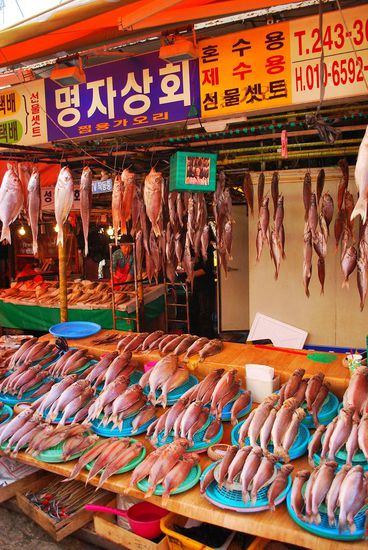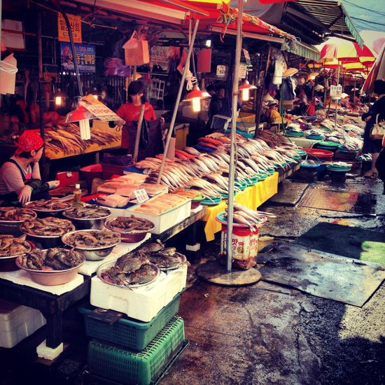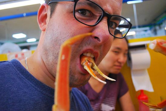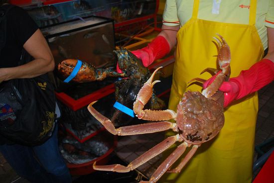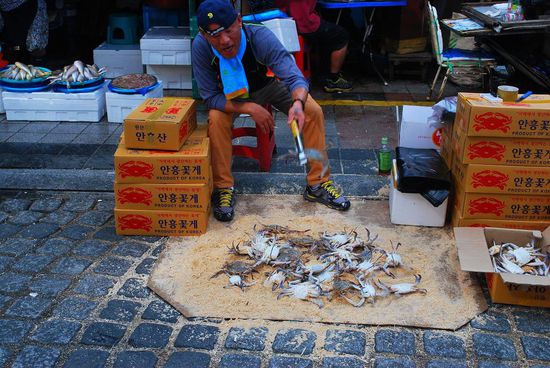 Zuerst fuhren wir mit dem Taxi in die Nähe des Fischerhafens mit dem größten Fischmarktes Busans. In den Straßen wimmelte es von Einheimischen, Touristen, unzähligen Shops und Snackständen. Jen führte uns zu einem kleinen Straßenstand auf einem kleinen Platz. Dort kauften wir kleine, warme, frittierte Teigtaschen in einem leicht salzigen Mantel mit süßem Herz aus Haselnuss-, Sonnenblumenkernen und Schokoladencreme. Sehr empfehlenswert! Damit schlenderte wir weiter zum Fischmarkt. Der Fischmarkt in Busan ist riesig und es gibt eine unwahrscheinliche Vielfalt an Fisch und Meeresfrüchten. Krabben, Seegurken, Oktopusse, Kugelfisch etc. Die Gerüche dort sind allerdings gewöhnungsbedürftig. Leider gab es auch Hai- und Walfleisch. An vielen Ecken sah man auch getrockneten Fisch, z.B. getrockneten Oktopus. In einer Halle bestellte Jen für uns drei King Crabs (jede Krabbe wog ca. 1,5 kg) und einen Lobstar (Hummer) (ca. 3 kg). Sie wurden für uns ganz frisch zubereitet. Der Lobstar war den meisten etwas zu 'fischig' und zäh, die Krabben waren sehr zart und mild. Dazu gab es Wasabi - den man vorsichtig dosieren sollte, denn der Wasabi, den wir in Europa kennen, ist sehr viel milder. Allerdings ist dieses Essen auch in Korea sehr teuer und eher etwas Besonderes, als etwas Alltägliches.