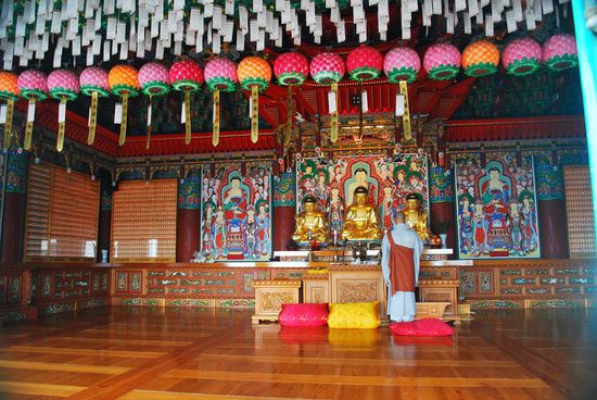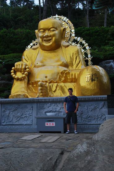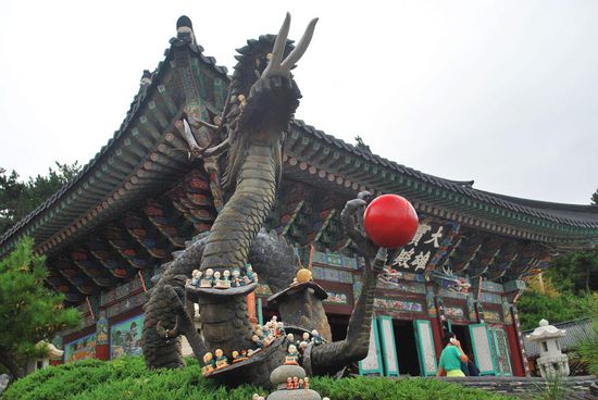Der Strand und die beeindruckende Skyline gaben in der Abendsonne und bei Einbruch der Dunkelheit ein wunderschönes Bild. Wir saßen noch lange am Strand, dann besuchten wir ein Barbecue House. Dort gab es die vielen koreanischen Beilagen, sowie Salatblätter zum Einwickeln des Fleisches und der Beilagen, und Schweine- und Rindfleisch. Das Fleisch wurde direkt am Tisch gegrillt. Es war ein toller Abend, bei tollem Essen. Mindestens vier Flaschen Reisschnaps (nicht so hochprozentig wie es sich anhört) und diverse Flaschen Bier wurden geleert, so wie es sich in Korea zu einem ordentlichem Barbecue gehört. Danach pilgerten wir ins Hotel und machten es uns in unseren Whirlpools, die es auf jedem Zimmer gab, bequem. Am nächsten Morgen checkten wir aus und nahmen den Bus zum "Yongkung Temple". Der einzige Tempel der in Südkorea direkt am Pazifik erbaut wurde. Man hat von dort eine tolle Aussicht auf die Felsen und das Wasser. Im Anschluss fuhren wir wieder zurück und spazierten noch einmal am Strand entlang. Gegen 14 Uhr besuchten wir ein Restaurant, in dem es ausschließlich Speisen mit Kugelfisch gab. Wir entschieden uns für einen Kugelfisch der die wissenschaftliche Bezeichnung "Takifugu stictonotus" trägt . Dazu gab es Reis, Schweinefleisch im Teigmantel, diverse Beilagen, Chilipaste, Schnitzelsoße, Krautsalat in Joghurtdressing und Tofu. Der Fisch wurde im Ganzen in einer Suppe und paniert als Fischschnitzel serviert. Beide Zubereitungsvarianten und die Beilagen waren sehr gut, auch die Soße kam besonders gut an. Wieder ein gelungenes Essen und gar nicht mal so teuer. Nach dem Essen fuhren wir mit dem Taxi zum Bahnhof und nahmen pünktlich um 16 Uhr den Zug zurück nach Seoul.