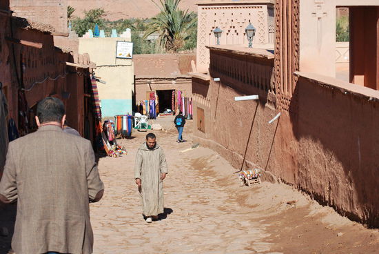 Wir erreichen einen weiteren Höhepunkt der Reise: Die Kasbah Ait Ben Haddou. Eigentlich nur eine weitere Wohnburg der Berber aus Stampflehm erbaut, die Ursprünge sind scheinbar irgendwann zwischen dem 12. und 16. Jahrhundert zu suchen. Ait Ben Haddou wurde wohl mal von ca. 1000 Menschen bewohnt, heute ist sie zwar UNESCO-Weltkulturerbe, aber nicht mehr bewohnt. Ait Ben Haddou liegt auf ca. 1300 m Höhe und bietet einen sagenhaften Ausblick von ganz oben auf die umliegende Landschaft. Das Teil verursacht aber auch ganz schöne Probleme, denn die Erhaltung gestaltet sich zunehmend schwierig und ist extrem kostenintensiv. Es hilft, dass auch diese Kasbah immer wieder eine Film-Kulisse ist. Beispiele für hier gedrehte Szenen aus Hollywood-Blockbustern kann ich sehr zahlreich benennen: