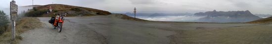 Der Wind bließ die Wolkendecke langsam aber stetig den Hang hinauf. Mein Zylinderchen knisterte vor sich hin. Ich genoss die Aussicht und konnte gar nicht fassen wie extrem dieser kleine Pass doch war.