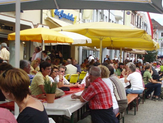 Nun plagte uns aber wirklich der Hunger, und wir hatten Glück, denn Essen gab es an diesem Tag in Speyer überall. Wir hatten es bei der Buchung gar nicht gewusst, aber heute fand hier ein Volksfest statt, die "Kaisertafel". Seit 1990 findet dieses Fest am zweiten Wochenende im August statt, damals zuerst anlässlich des 2000-jährigen Jubiläums der Stadt. Die Tradition reicht aber zurück bis zu Konrad III, der auf diese Art ein Mahl für Hunderte von Soldaten gab. Vom Dom bis zum Altpörtel, dem Stadttor, werden lange Tische aufgebaut und die Wirte und Restaurants verkaufen ihre Gerichte. Man kann sich also von einem Ende der Stadt bis zum anderen durchessen, wenn man möchte...