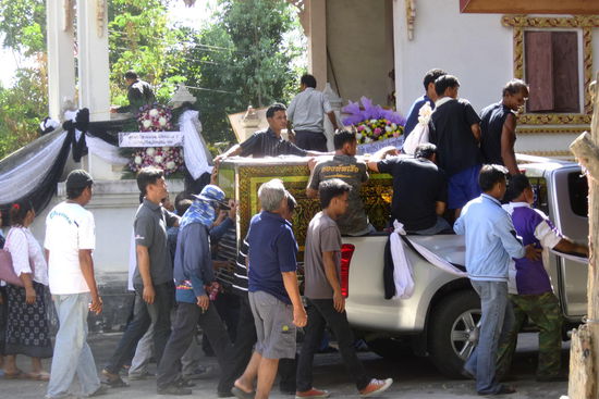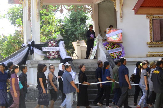 Hierbei stellten wir auch fest, das die Menschen hier die Trauer völlig anders verarbeiten als wir. Sie waren eher fröhlich gestimmt, wir als Farangs waren herzlich willkommen und durften sogar fotografieren und filmen. Während des Trauerzuges wurden Blumen und Süssigkeiten