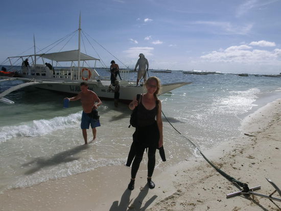 Wir sind wieder zur vorgelagerten Insel Balicasag aufgebrochen und die uns schon bekannten Tauchplätze "Black forest" und "Rico's wall" standen auf dem Programm. Die Sichtweiten waren heute nicht so überzeugend, aber die Plätze sind spektakulär und die Unterwasserwelt zieht auch bei weniger Sicht alle Register. Da wir kaum Strömung hatten, war das Tauchen easy und relaxed. Maritta ist wegen ihrer gewonnenen Erfahrung und Dank eines ausgetauschten Jackets völlig euphorisch. Das tarieren klappt besser und der gestrige Guide, der sich mit anderen Tauchern wieder einen Faux pas geleistet hat, ist weit weg.