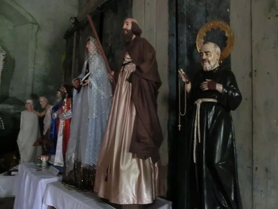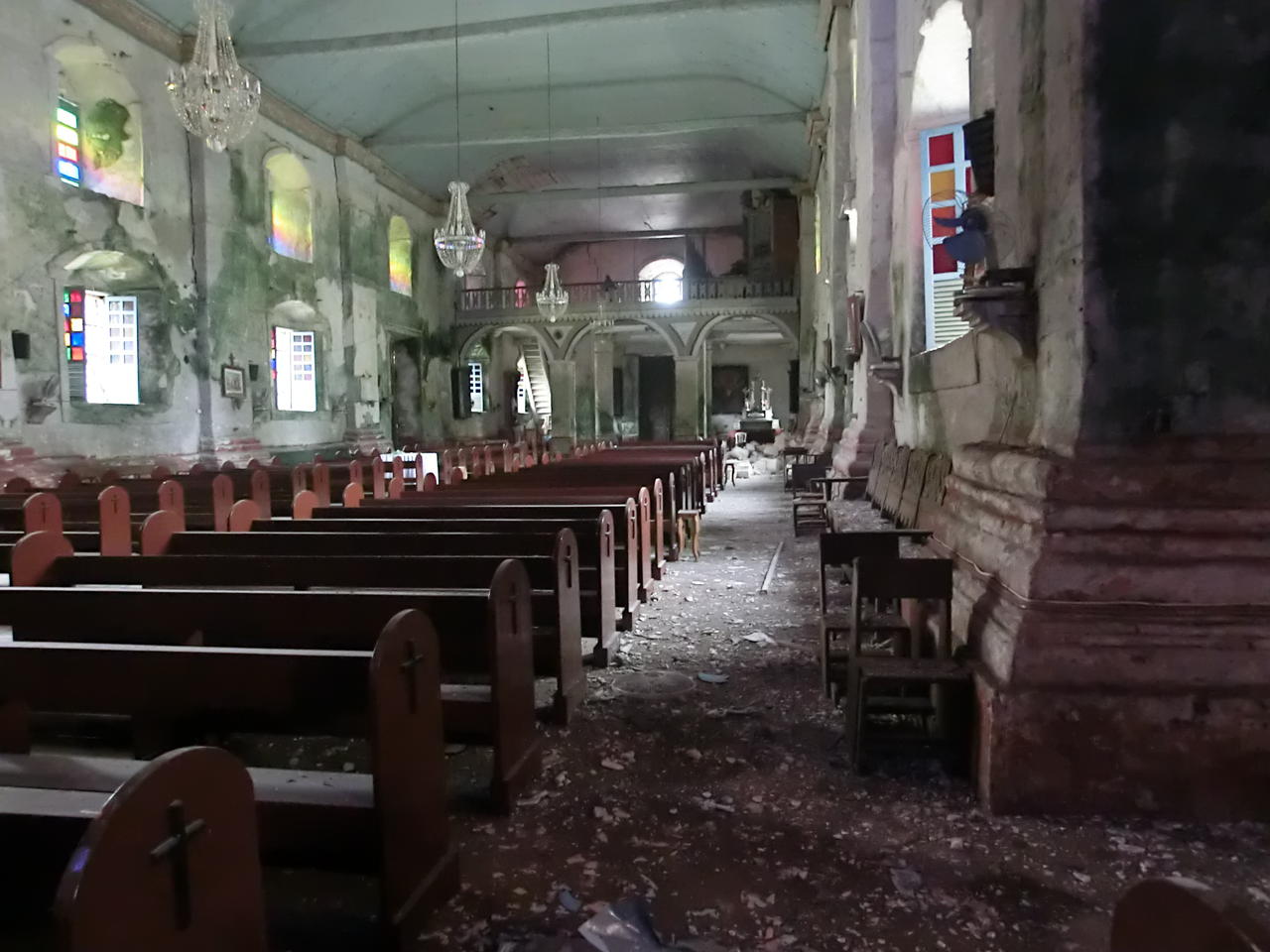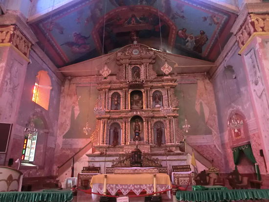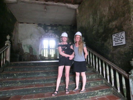 Auf dem Weg machen wir Halt an der zweitältesten Kirche der Philippinen, die durch das Erdbeben teilweise eingestürzt ist, aber das kleine Museum können wir uns anschauen und den erhaltenen Teil der Kirche auch. Zum Schutz müssen wir Helme tragen. Uns gefällt nicht nur das Museum, sondern auch der Altarraum, der durch farbige Glasscheiben in pinkfarbenes Licht getaucht wird.