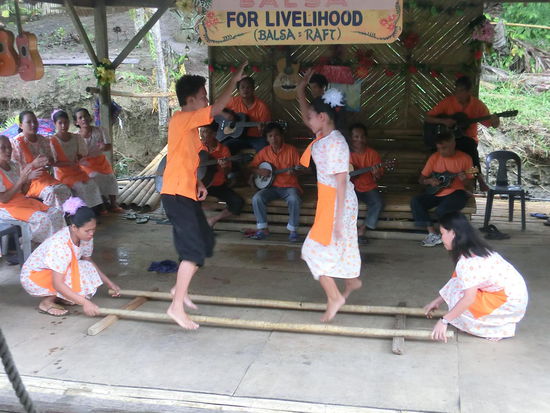 Unterwegs halten wir an einem Ponton mit Orchester und Tänzerinnen, die mit fröhlichen Gesängen und einem Bambusstangentanz auf eine kleine Spende hoffen. Das Ganze ist eine Touristenveranstaltung und zeigt natürlich nur die schöne Seite. Die andere Seite wird deutlich, als wir wieder anlegen und sehen, welche Schäden das Erdbeben an der Anlegestelle hinterlassen hat ...