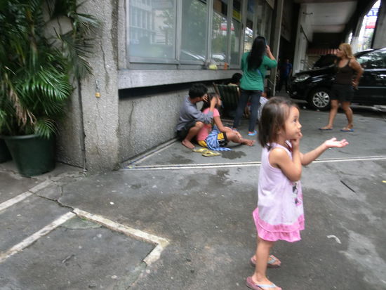 Heute vormittag haben wir erfolglos versucht, den "Hop on Hop off"- Bus durch Manila zu erwischen. Noch nicht mal eine Haltestelle haben wir gefunden. Wir waren vom Nichtstun und Rumsitzen, fragen, verschickt werden, warten, woanders warten, woanders fragen schon ein wenig genervt. Die kleinen Gassen und Straßen im Hotelviertel haben uns schon viel bessergefallen, als der am stinkenden Meer liegende Prachtboulevard. Die Gassen sind so, wie man es kennt aus SOA, allerdings sehr arm. Viele Menschen leben offensichtlich auf der Straße, genau wie die mageren, verdreckten Hunde und Katzen. Ein schwarzes Lamm dazwischen. Viele Kinder betteln schon, während sie an der Brust der schlafenden Mutter saugen.