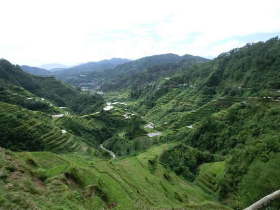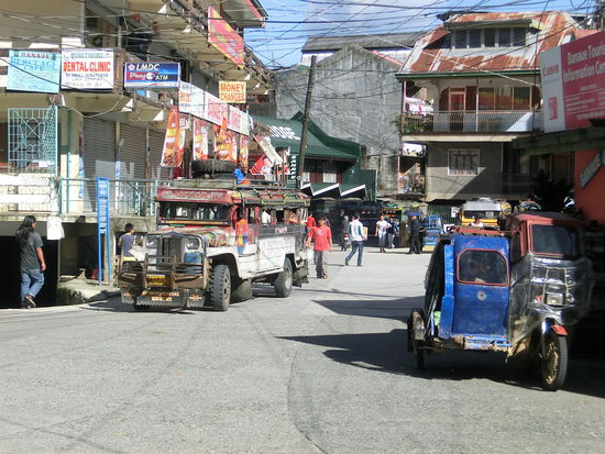 Sonne beim Aufwachen - und wir sehen erstmals, wie schön der Ort ist, nachdem gestern die Aussicht nebelverhangen war. Der Guide möchte am liebsten noch eine längere Tour mit uns machen (die Pesozeichen blinken in den Augen), aber dann entscheiden wir uns dagegen und lassen uns die 5 Km mit dem Tricycle zum "Banaue View Point" bringen, um in eigenem Tempo wieder in den Ort zu laufen. Oben haben wir eine fantastische Aussicht auf die Reisfelder. Aus jeden Blickwinkel sehen sie anders aus.