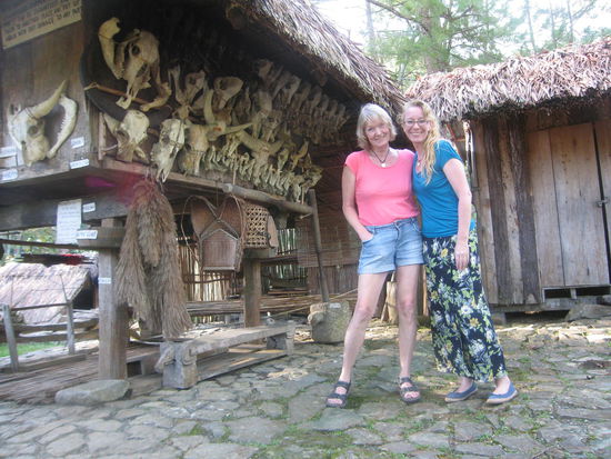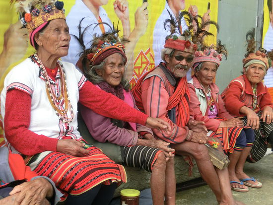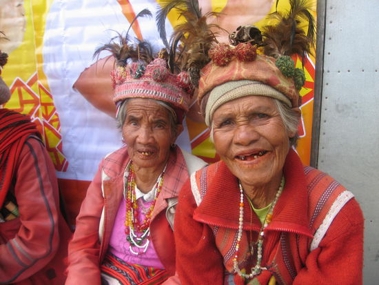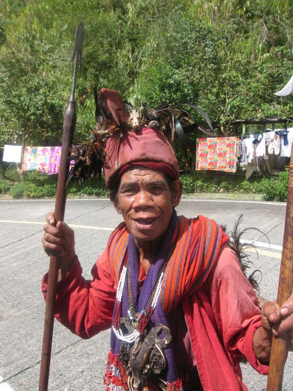 Was uns noch mehr gefällt, sind die "Ifugao", Menschen von einem Bergstamm, der einstmals die Reisterassen in diesem Gebiet angelegt hat. In ihren traditionellen Trachten lassen sie sich gegen eine kleine Spende fotografieren. Prachtvoll anzuschauen sind sie in ihren rot-rosa-orangenen Gewändern und federbesetzten Kopfschmucken. Wir sind hin- und hergerissen, fotografieren und geben gerne ein paar Peso. Vermutlich deren einziger Lebensunterhalt. Die meisten von ihnen sind alt, zahnlos und blind.