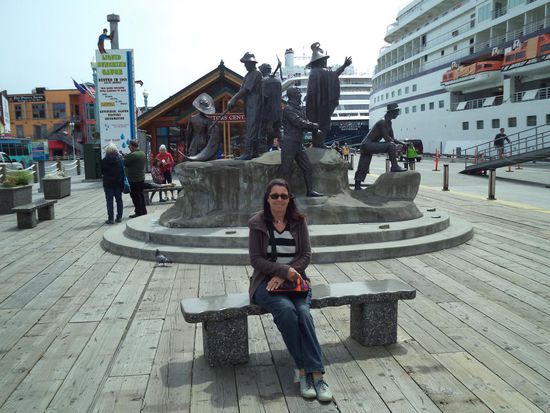 Nach einen ruhigen Nacht gehen wir so gegen 8 Uhr zum Frühstück. Das Schiff hat in Juneau angelegt, der Hauptstadt von Alaska. Wir wollen sie uns ansehen und steigen aus. Mit zwei älteren teilen wir uns das Taxi. Wir gehen in das Rathaus, darin steht ein riesiger Totem. Von der Terrasse aus kann man über den Hafen, in dem auch drei Kreuzfahrtschiffe stehen, sehen.
