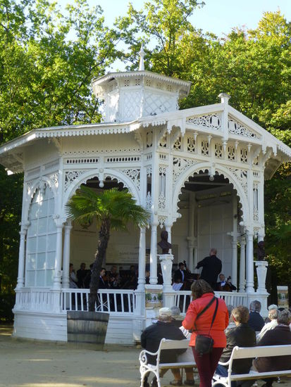 Ziel ist zunächst Bad Elster, ein ehemals mondänes Kurbad in dem sich der Glanz vergangener Zeiten erahnen lässt. An diesem wunderschönen Herbstsonntag flanieren die Besucher zuhauf durch die Kuranlagen und geniessen mit uns noch einmal den Sonnenschein. Wir können sogar eine Kaffeepause im Straßencafé einlegen und hier den typisch vogtländischen Kartoffelkuchen probieren.