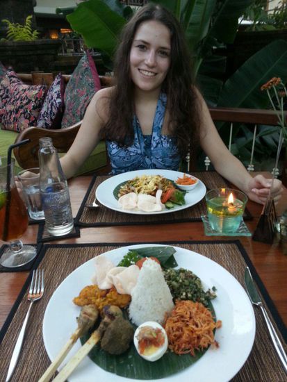 Zuhause angekommen nutzen wir die Gelegenheit für ein paar ruhige Minuten in unserem kleinen, aber absolut idyllischen Pool. Danach ging es für uns dann zu Fuss weiter in das Zentrum von Ubud. Wir durchquerten einen Markt an dem jeder seine Ware an den Mann bringen wollte. Eigentlich verkauft hier jeder das gleiche und da wir heute eh bereits eingekauft hatten, gingen wir einfach nur durch und liesen alles auf uns wirken. Da sich auch langsam der Hunger bei uns breit machte, suchten wir uns ein schönes Lokal am Strassenrand auf. Wir genossen unser Essen im wunderbaren Ambiente und unter freiem Himmel. Es schmeckte wie immer hervorragend!
