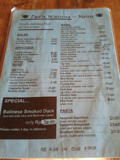 Da sich langsam der kleine Hunger einschlich ,beschlossen wir loszuziehen um etwas zu essen. Heute wollten wir in kein Restaurant gehen, sondern in einen Warung. Ein Warung ist eine Art kleines Restaurant dass vllt. in Sachen Auswahl und Ambiente nicht mit einem Restaurant mithalten kann, dafür aber in Sachen Herzlichkeit,Flair und Preis einem Restaurant deutlich überlegen ist. Wir suchten uns einen Warung , der in unserem Reiseführer empfohlen wird und marschierten los. Wir saßen keine paar Minuten , dann trafen wir eine Schweizerin welche wir schon vom Vortag her kannten. Sie setzte sich zu uns und wir aßen und tranken zusammen. Wir tauschten Erfahrungen und Erlebnisse aus, erzählten von unseren nächsten Plänen und sprachen einfach über Gott und die Welt. That´s backpacking!