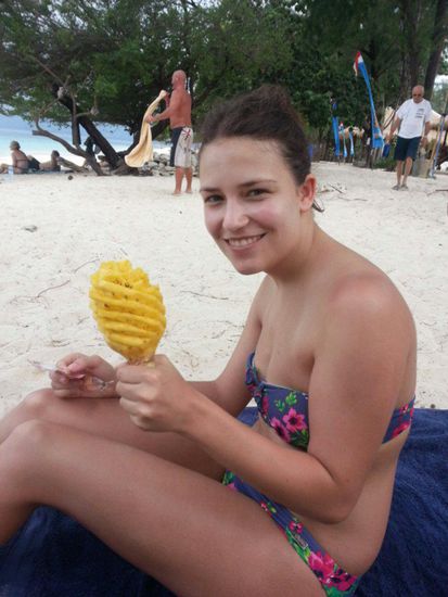 Die Ananas hier auf Gili Meno schmecken fantastisch. Super süß und super saftig! Und ne ziemlich coole Art eine Ananas zu essen oder ?