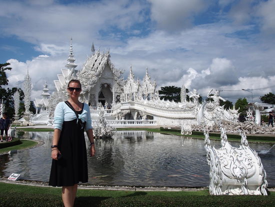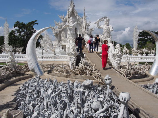 Spaeter aufgestanden aber kuerzer geschlafen haben wir uns gegen 11 (nach ausgiebigem Fruestueck) zum Wat Rong Khun, dem weissen Tempel aufgemacht. Der weisse Tempel wurde erbaut von einem thailaendischen Kuenstler der an vielen Stellen im Norden zu sehen ist (zum Beispiel auch der goldene Uhrturm in Chinag Rai). Wahrlich einer der schoensten und mit Sicherheit der aussergewoenlichste Tempel in Thailand. Der Innenraum des Tempel ist "verziert" mit Zeichnungen von Michael Jackson, The Beatles, Neo von Matrix, Superman etc. Aber auch das brennende World Trade Center ist abgebildet. Ich denke mal der Kuenstler will damit ein Abbild der heutigen Welt kreieren? Ich weiss es nicht, vielleicht kann mir ja einer der Leser weiterhelfen. Von aussen ist der Tempel komplett in Weiss mit kleinen Spiegeln gehalten. Traumhaft, aber ohne Sonnenbrille nicht moeglich ihn zu betrachten. Insgesamt ein absolutes Must See in Thailand.
